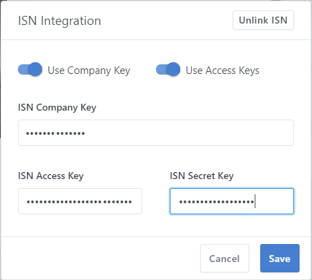 Then you can enter your ISN company key, access key, and secret key. Notice that, by checking and unchecking the "Use ISN Company Key" and "Use ISN Access Keys" you'll be asked for different login methods.