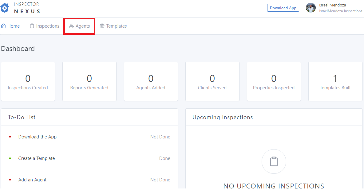 On the Inspector Nexus dashboard, click on the "Agent" tab.