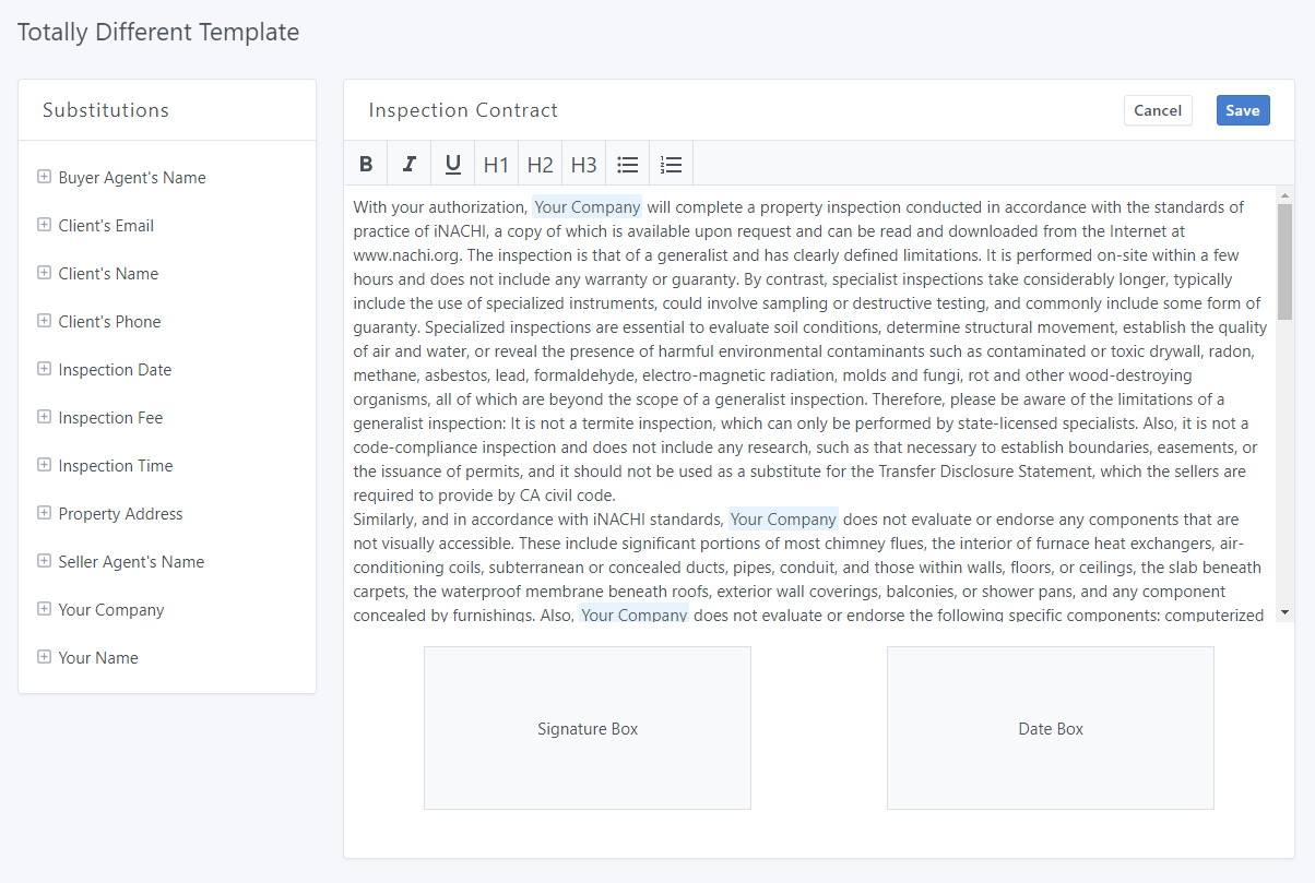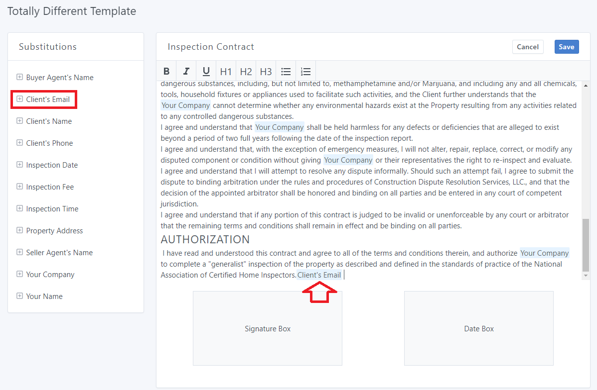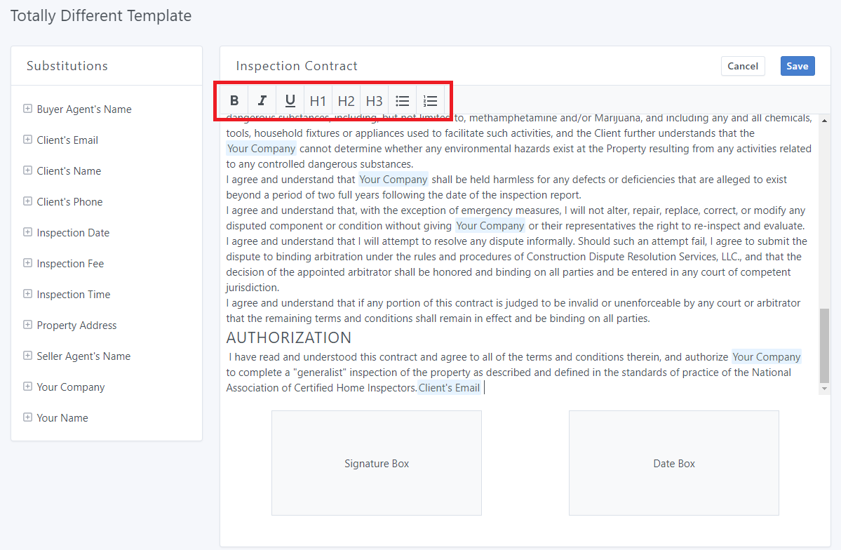 From there, you can customize everything about your contract, like the font size, formatting, and content. You can also add substitutions, like "Client Name", which will be switched out accordingly for each inspection.