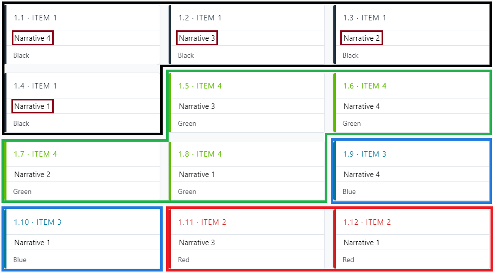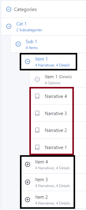 Notice the order of the narratives under Cat 1 --> Sub 1 --> Item 1 (Narrative 4, Narrative 3, Narrative 2, Narrative 1).