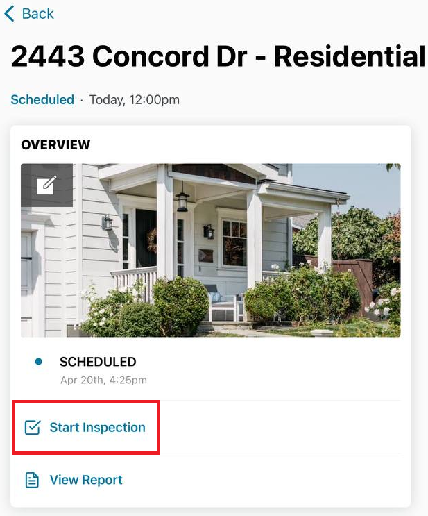 First, open the inspection using the Mobile Application and tap on Start Inspection: